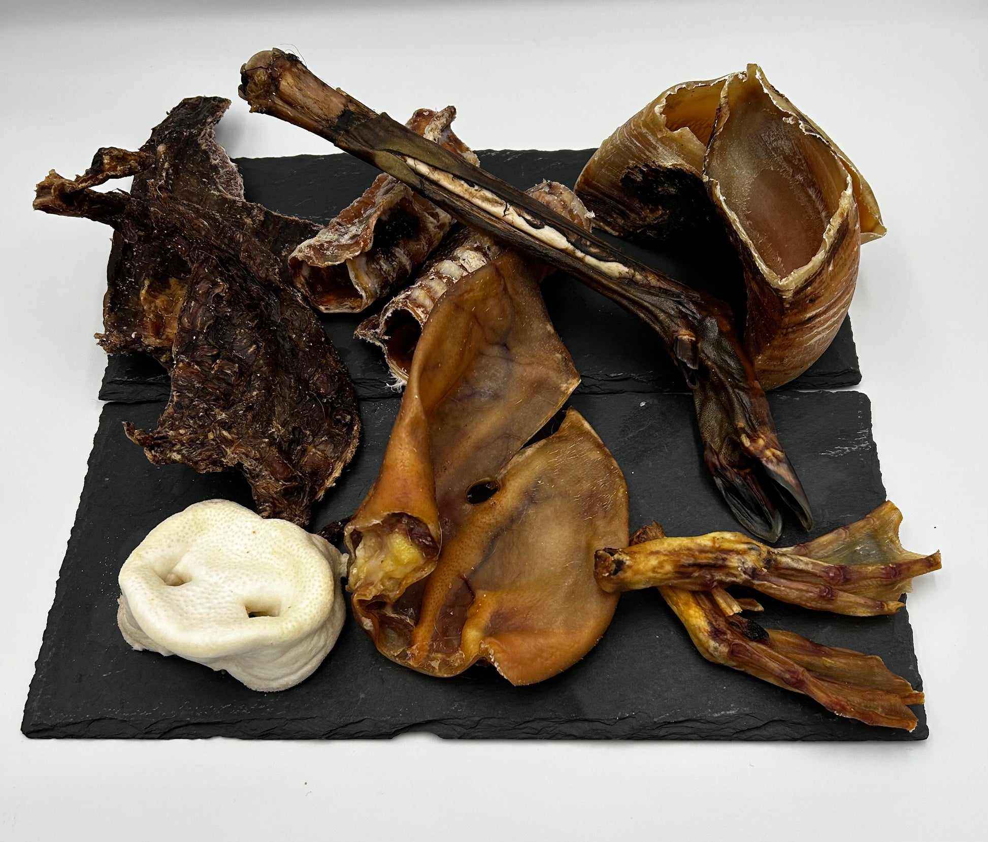 1 Pigs Ear, 2 Beef Trachea (10cm approx), 2 Beef Lips, 2 Duck Feet,1 Roe Deer Foot, 2 Beef Hooves, 1 Puffed Pig Snout.