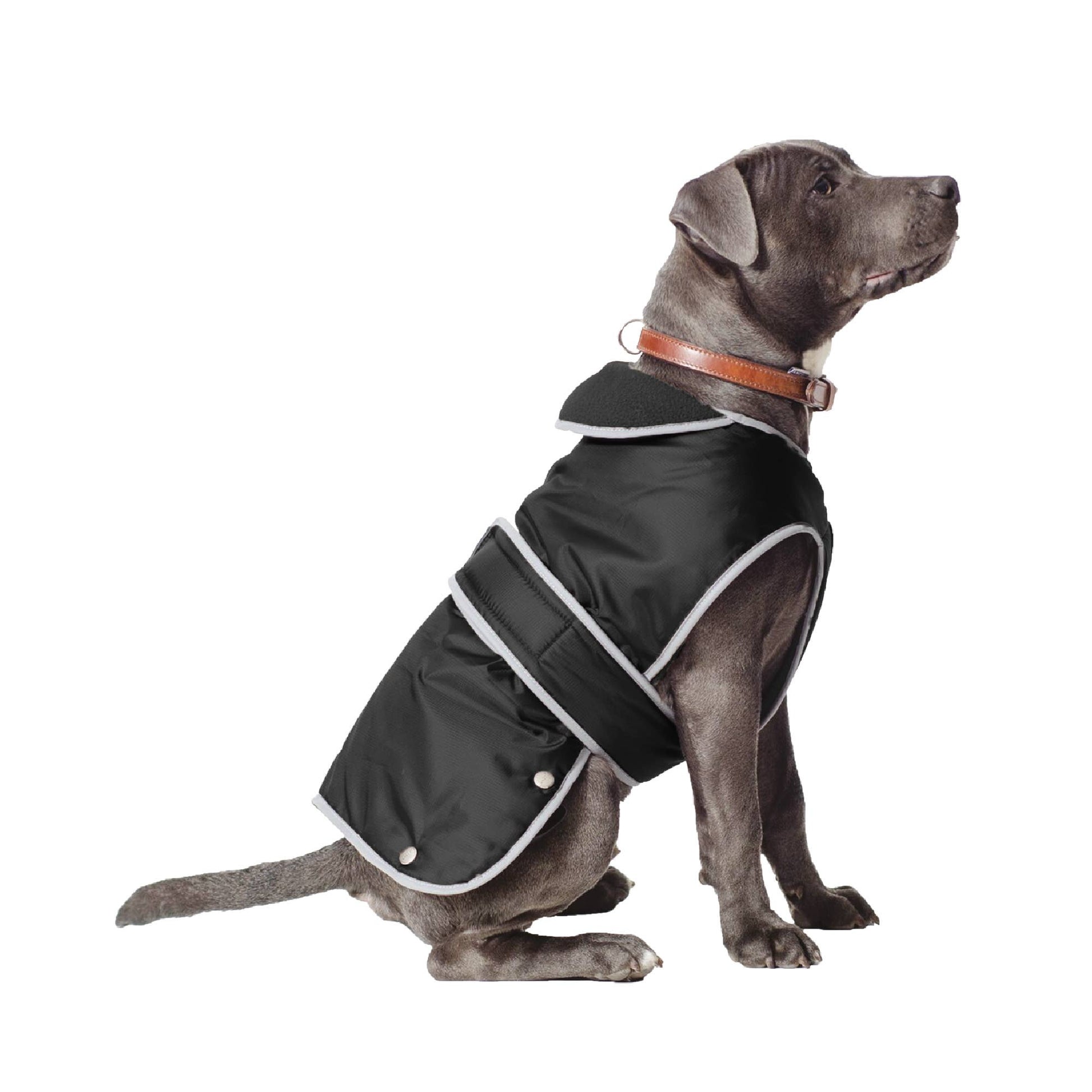 A best seller, it features our “splashguard” full coverage for your pet’s chest and body, and a waterproof surface to keep your dog as clean and dry as possible. An internal fleece lining provides thermal protection against the cold and blustery winds, so your dog is warm and snug during their walks. Designed with adjustable hook and loop spine fastenings and elasticated leg straps/neck hole. A secure and comfortable fit for various breeds. . Reflective edging to increase visibility in low light so you and your dog can remain safe and seen. The Dog Coat has a convenient zippered harness slot that sits along your dog’s back, allowing for quick and easy lead attachment to your dog’s walking or travel harness, which can be fitted underneath the coat.